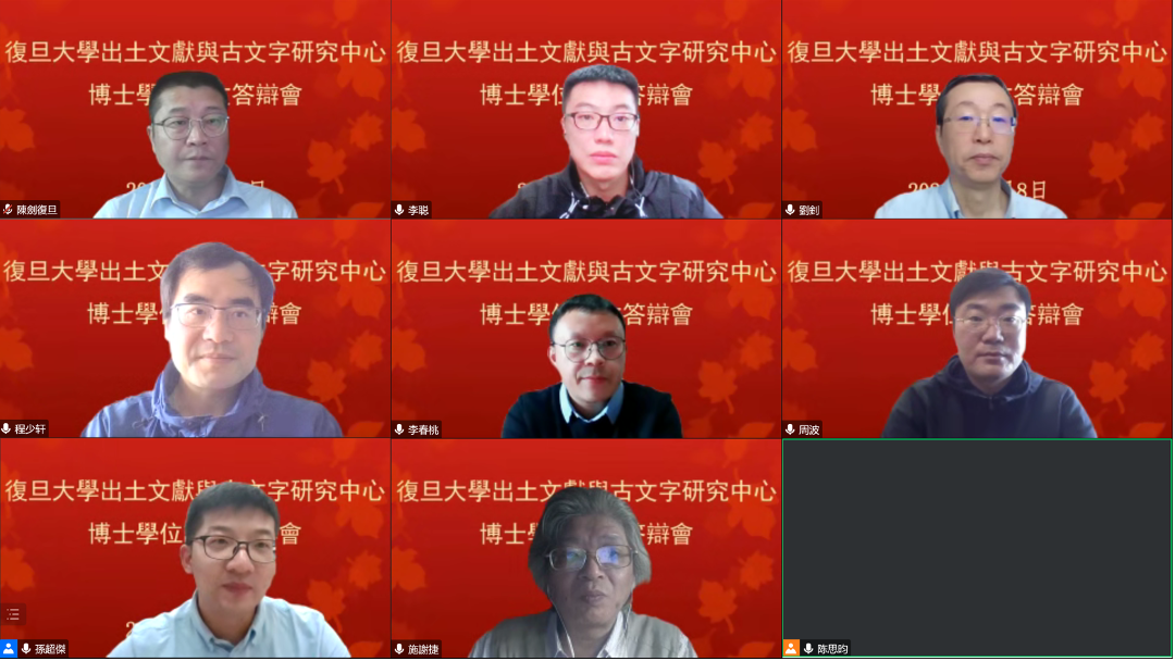 孫超傑的博士論文題目爲(wèi)《隸定古文相關(guān)問題研究》,導(dǎo)師爲(wèi)陳劍教授。答辯委員會由吉林大學(xué)古籍研究所李春桃教授、南京大學(xué)文學(xué)院程少軒教授、復(fù)旦大學(xué)出土文獻與古文字研究中心劉釗教授、施謝捷教授、周波研究員組成。李春桃教授擔(dān)任答辯主席,李聰博士擔(dān)任答辯秘書。