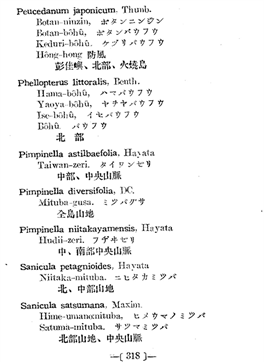 日本學者的相關文獻可能是指1928年臺灣博物學會出版的《臺灣植物名彙》(1928,Syuniti Sasaki,List of Plants of Formosa,Ⅰ-ⅩⅩⅥ,562p;The Natural History Society of Formosa,Taihoku[Taibei].),該書318頁[21]在本藥拉丁文名下提示的日文信息似是:牡丹-人薓、牡丹-防風、浜防風;中文信息則是:防風。彭佳嶼、北部、火燒島等?!杜_灣植物名彙》一書的作者是佐佐木舜一?!白糇裟舅匆唬?span>1888-1961),日本占領臺灣時,對臺灣植物資源調查重要的植物學者之一,足跡遍及全臺及離島;發(fā)表相關文章不下數十篇?!?/span>[22]