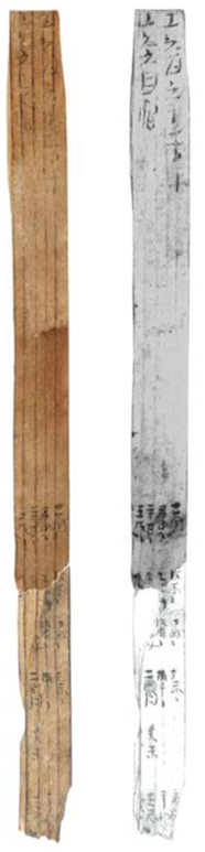 簡Ⅱ90DXT0114②:254與簡Ⅱ90DXT0114②:136A屬於同一探方,僅存首行“辛酉、壬戌、癸亥”三個干支,殘損嚴(yán)重,但同樣爲(wèi)縱式分欄木牘,或與之屬於同一曆書。[10]