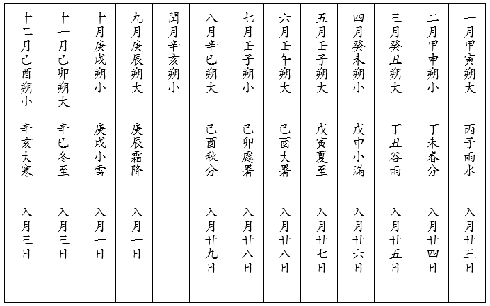 此簡出土完整,簡文記錄該年二月大小及朔日干支,其後寫有“春分”所在的干支及該月對應(yīng)日期(廿四日)。符合此條件的年份爲(wèi)五鳳二年(公元前56年)。該簡形制特殊,應(yīng)屬於一部完整曆書。原曆書可能由十三支簡組成,每支簡列舉一個月的月大小、月朔干支,以及該月中氣所對應(yīng)的干支和日期。[12]原曆書或可復(fù)原如下: