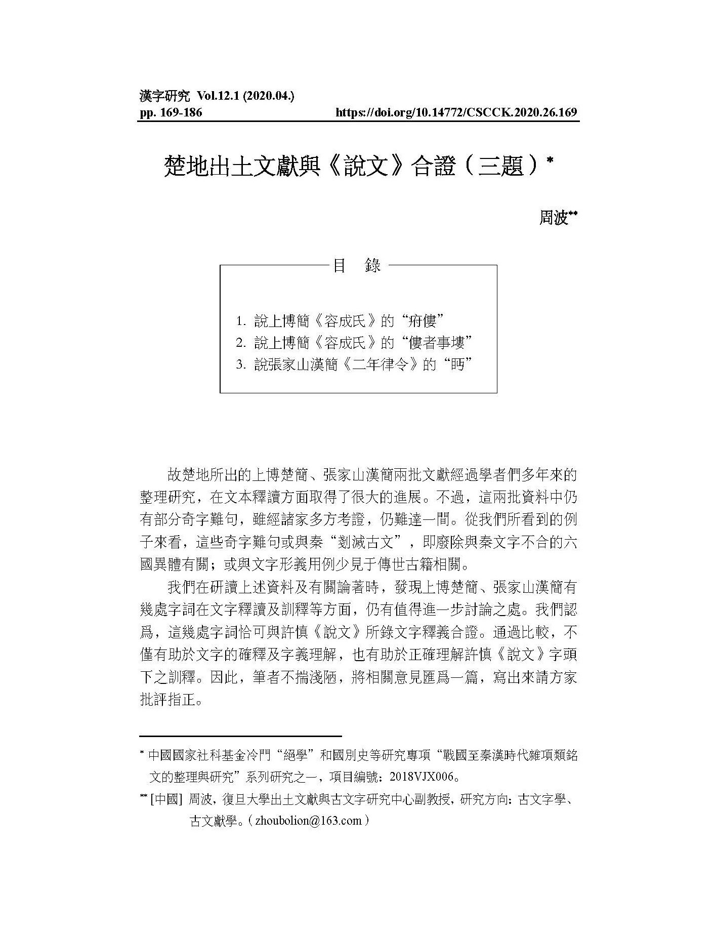 周波:《楚地出土文獻(xiàn)與〈說(shuō)文〉合證(三題)》,韓國(guó)《漢字研究》,2020年第1期。