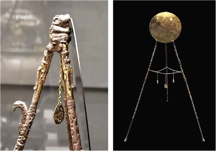 而石楬M1:49的“金鑷挍”和M1:56的“鑷挍”之“鑷”又當(dāng)是一類垂掛為飾的構(gòu)件,并不直接附著于器物上。東漢太皇太后、皇太后入廟所服之簪“端為華勝,上為鳳皇爵,……下有白珠,垂黃金鑷”,其組合恰與石楬所記相當(dāng)。[9]東漢至初唐的高等級(jí)墓葬中常出土一類小巧的桃形金飾,也偶見云母所制,尖端常有穿孔,多出土于女性墓主遺骨頭部附近,當(dāng)屬步搖垂飾,即所謂“黃金鑷”。時(shí)器物亦飾“鑷”,如《西京雜記》謂漢昭陽殿內(nèi)九金龍所銜九子金鈴垂“五色流蘇。帶以綠文紫綬,金銀花鑷”,又言武帝時(shí)“長(zhǎng)安始盛飾鞍馬”,“或加以鈴鑷,飾以流蘇”。《子虛賦》“繆繞玉綏”顏師古注還說“綏即今之所謂采?垂鑷者也”。[10]據(jù)《隋書·禮儀志五》載:“又齊永明制,玉輅上施重屋,棲寶鳳皇,綴金鈴鑷珠珰玉蚌佩。”[11]《通典·禮二四·沿革二四·嘉禮九·天子車輅》作“初加玉輅為重蓋,棲寶鳳皇,綴金鑷珠珰玉蚌佩”。[12]此類車蓋垂飾抑或與石楬所記“白珠、金鑷挍帳上璧”“連璧佩勝一,白珠挍”“白珠挍□玉佩”等相當(dāng)。蘇州虎丘路新村土墩三國(guó)孫吳墓M2出土一件銀質(zhì)鎏金銅三腳架,一般認(rèn)為是鏡架,架上以金鏈垂掛四枚桃形鏤空金飾(圖1),即是器物垂“鑷”之實(shí)例。是以M1∶49的“白珠、金鑷”與“帳上璧”的組合也不能說是“用‘挍’的工藝制作”,因?yàn)?span>“