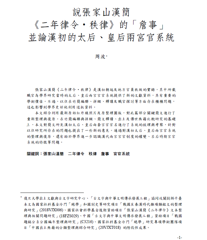其中,復(fù)旦大學(xué)出土文獻(xiàn)與古文字研究中心研究員周波的論文《說(shuō)張家山漢簡(jiǎn)〈二年律令·秩律〉的“詹事”并論漢初的太后、 皇后兩宮官系統(tǒng)》獲提名。