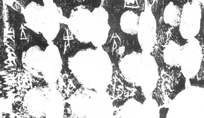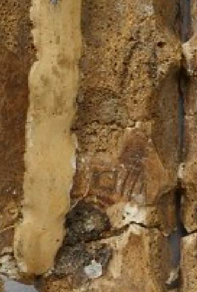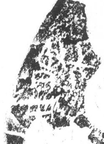 正面13辭曰:“乎《摹系》7433反面2辭曰“取日?伐”,《新研》乙6273反面D辭釋作“取合伐”。根據(jù)清晰照片,《新研》D辭釋文更為合理。該辭位于右首甲二排第1個卜兆處,與正面兆序“一”對應(yīng)。因為拓片模糊不清,故單看拓片容易將所施之鑿尖狀的前端訛混作刻寫的筆畫。照片中“取合伐”三字涂墨,“合”字跨右首甲與右前甲夾角[10]齒紋,且與右前甲夾角一排第1個鉆鑿存在打破關(guān)系,形體依稀可辨,參考圖一。“合”在卜辭中有會合、聚合義[11]。“合”可以用在不同祭名之間,如《屯南》248有辭曰“貞:又(侑)