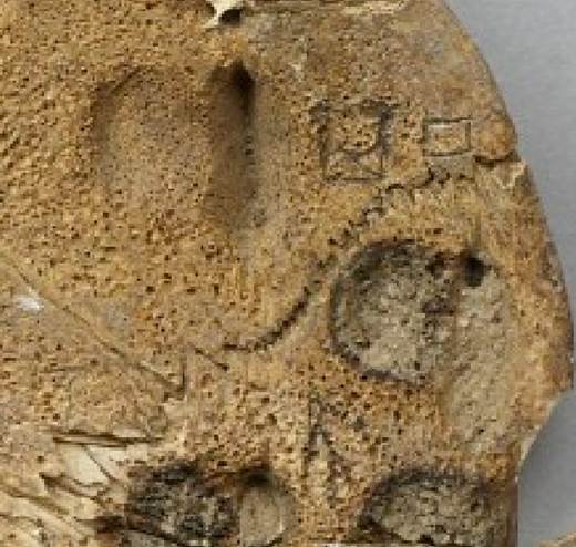 于甲省”一辭圍繞左尾甲一排第1個鉆鑿由兆枝梢部起始向兆干方向自上而下轉(zhuǎn)而向上刻寫,對應(yīng)兆序為“一”?!?span style="line-height:2;position:relative;top:1.0pt">