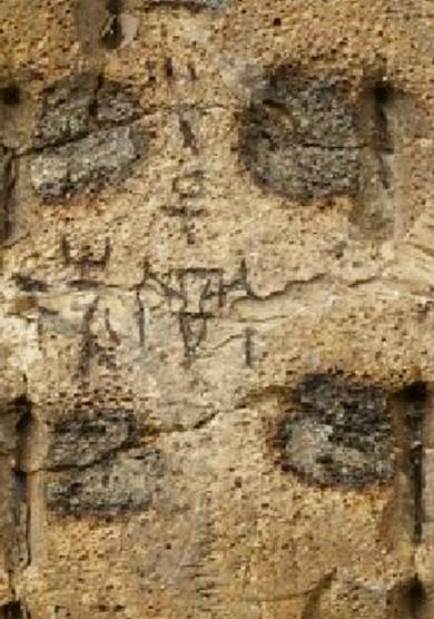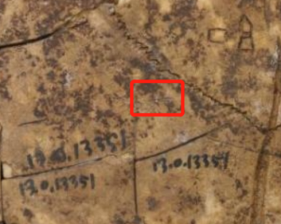 ”位于左后甲與左尾甲交接之處上方,靠近千里路?!坝凇弊治挥诤蠹?、尾甲及千里路齒紋交接之處,字的基本形體掩于其中,雖容易與龜甲自然齒紋混淆,但“于”字兩橫筆正處齒紋交接夾角間,豎畫明顯?!?span style="line-height:2;position:relative;top:1.0pt">