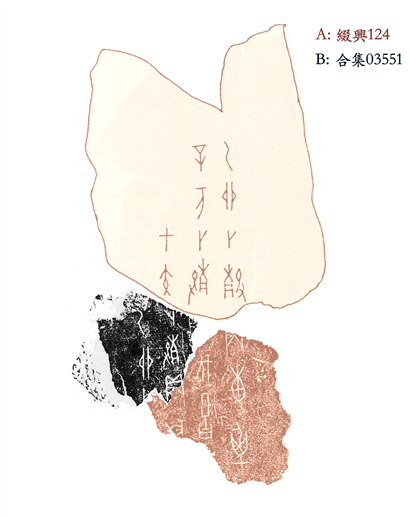 《綴興》124(圖中A)本爲(wèi)兩片遙綴,張宇衛(wèi)先生根據(jù)同文例、刻寫位置、字形間距,論說該組可能成立。新綴拼入中間缺失部分,使三塊殘片相互實綴,證實《綴興》124的遙綴可信。[4]