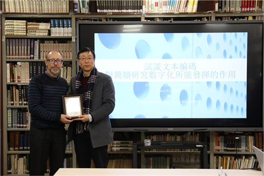 講座結束後,陳劍教授對講座內容加以總結,中心劉釗教授、蔣玉斌研究員、張傳官研究員、石繼承副研究員、任攀青年副研究員等與陶安教授就文本數字化以及簡帛標記等問題進行了討論,陶安教授也回答了聽衆(zhòng)提出的若干問題。最後,中心劉釗教授代表中心向陶安教授頒發(fā)了講座證書。