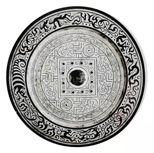 此鏡鏡緣較寬,奇異的平雕畫紋帶由兩個錢紋一分為二。錢紋兩側散佈變異雲氣紋。一側為一枚圓形方孔的大泉五十,另側為一枚同樣圓形方孔的大泉十五。雲氣之中,有虺紋、獸和麒麟等神獸,有羽人單膝著地、手持仙果飼鳳,另有羽人駕龍飛翔,分明就是一幅仙界生活圖景。在這裏,升仙後的主人將會幸福美滿,而大泉五十象徵著他們的生活依然富足無憂。