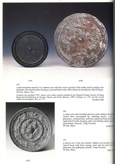 倫敦佳士得(Christie London)1992年6月8日的拍賣圖錄(圖一)中有編號145拍品,為一件西漢晚期福祿進兮銘八乳神獸博局紋鏡(圖二)。此鏡據(jù)稱為李爾白及駱桂生伉儷所藏。圖錄中介紹云,李爾白(1930-2021)為著名金石鑒藏家李蔭軒(1911-1972)之子,而李蔭軒先生為晚清重臣李鴻章(1823-1901)侄孫,其部分高古青銅器珍藏於1979年已捐贈予上海博物館,成為現(xiàn)藏於上博的重要珍器。