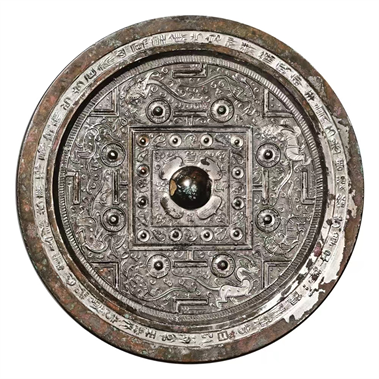 此鏡圓形,圓鈕,圓鈕座。座外一周凸弦紋內(nèi)飾九個帶座乳釘,間以草葉紋;弦紋外飾一方形凹面界格,四隅內(nèi)角飾以葉狀紋及草葉紋;其外方形界格內(nèi)飾以三線波浪紋,另有兩個凹面方形界格相鄰。界格外四組TLV博局紋將主紋飾區(qū)分割成四區(qū):四隅與V紋呼應(yīng),其間各飾一柿蒂紋座小乳釘;四正方向T紋與L紋呼應(yīng),八枚帶座大乳釘列於T紋兩側(cè)。主紋飾順時針方向依次可見東方青龍+雛鳥+羽人舞蹈和羽人持芝草、南方朱雀一對及一隻小雛鳥、西方白虎回首+長喙雀鳥+獨角獸以及北方玄武(龜蛇分體)+神獸。隙間飾滿芝草、簡單捲曲草葉紋等。外環(huán)一周左斜短櫛紋。緣上一周楚辭風格的四十九字銘文帶,右旋釋讀曰“福祿進兮日以前,食玉英兮飲澧(醴)泉,駕蜚龍兮乘浮雲(yún),白虎引兮上泰山,鳳皇(凰)集兮見神鮮(仙),葆(保)長命兮壽萬年,周複始兮傅子孫”,銘文起止符為並列三點。