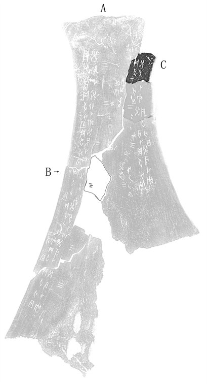 説明:B片及A所涉《甲編》諸片,係史語(yǔ)所第三次發(fā)掘所得之甲骨。B之綴入A,筆者曾在史語(yǔ)所庫(kù)房以實(shí)物驗(yàn)證,綴合成立。C片爲(wèi)施美士(Ernest Ketcham Smith)舊藏,此前以在傅斯年圖書館所作的摹本綴合,今用《施密士舊藏甲骨文字》拓本製圖。[1]