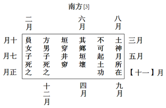 日書所見的土府神煞,其運(yùn)行週期不一致,孔家坡漢簡爲(wèi)正月寅,七月卯,十月辰,二月已,六月午, 八月未,三月申,五月酉,十一月戌,九月亥,四月子,十二月丑。,周家寨漢簡爲(wèi)正月寅,五月卯,九月辰,二月巳,五月午,八月未,三月申,五月酉,八月戌,九月亥,四月子,十二月丑。周家寨漢簡的土府神煞出現(xiàn)了月序的多次重複,理解起來較爲(wèi)困難,通過兩份簡牘的內(nèi)容,我們能確定正月、二月、三月、四月、八月、九月、十二月土府神煞運(yùn)行所在辰位,即正月寅、二月巳、三月申、四月子,八月未、九月亥、十二月丑,又因爲(wèi)二簡內(nèi)容一致,且爲(wèi)相同神煞,故通過對(duì)讀,可認(rèn)爲(wèi)周家寨漢簡的土府與孔家坡漢簡土府神煞每月運(yùn)行辰位一致。