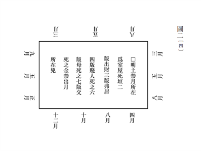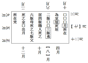 □□□月所在【207貳】為室屋,死。垣【208貳】,二版,□□;三版,弗【209貳】居;四版,賤人死之【210貳】;六版,母死之;七版,父【211貳】死之。金□出月【212貳】所在,兇(兇)。