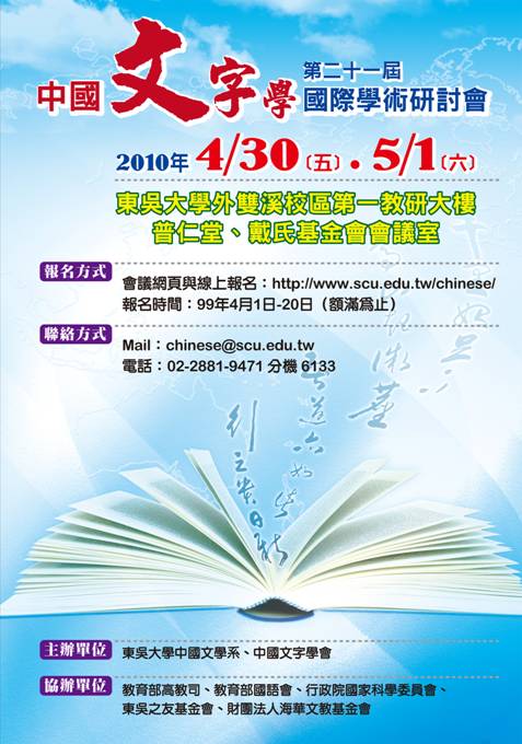 第二十一屆中國(guó)文字學(xué)國(guó)際學(xué)術(shù)研討會(huì) 2010年4月30日至5月1日在東吳大學(xué)召開。 本次會(huì)議由東吳大學(xué)中國(guó)文學(xué)系、臺(tái)灣中國(guó)文字學(xué)會(huì)主辦。海峽兩岸及日本、韓國(guó)學(xué)者三十余人與會(huì),提交論文33篇。