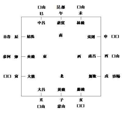 其中每小句的前半截是十二個音律名稱加上各律名所對應的數(shù)。這套律名系統(tǒng)在《呂氏春秋·音律篇》等文獻中有記載。[2]令人不解的是每小句的最後一個詞。這一系列名詞似都是地名,但它們爲何與這些音律名寫在一起?我們擬在這篇小文中嘗試對這些地名進行解釋。