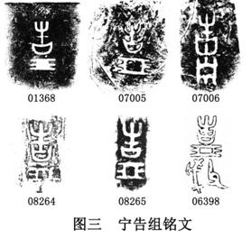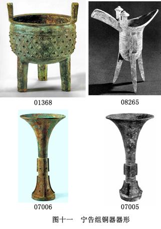 首先討論經(jīng)過正式考古發(fā)掘出土的告寧鼎 (01368)、告寧爵(08265)、告寧觚(07006)的年代。前兩件出土于殷墟西區(qū)孝民屯M1118,第三件出土于殷墟西區(qū)孝民屯M907,這兩座墓葬都屬于殷墟第四期[27]。因此可以確定上述三件寧告組銅器的年代大約屬于殷墟四期或稍早。且前兩件共存于同一座墓,與第三件所在墓葬相距不遠,銘文一致,應可以肯定上述三件銅器是由同人制作。
