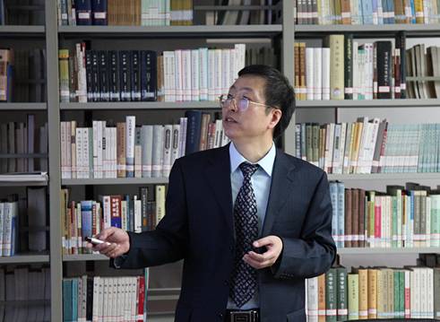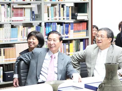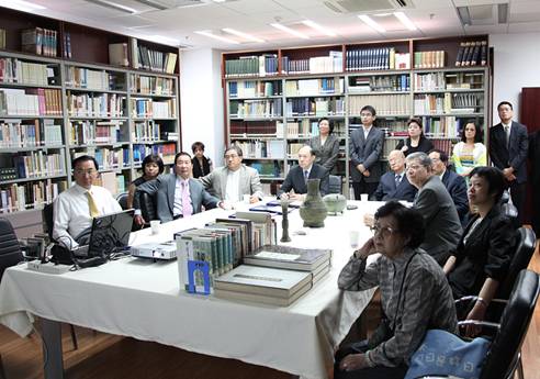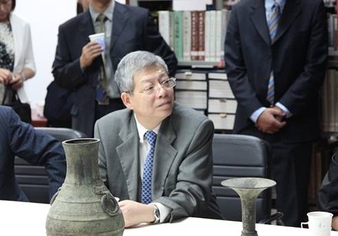 李兆基校董一行首先在中心資料室參觀了復(fù)旦大學(xué)藏甲骨、青銅器等珍貴文物,隨后聽取了中心主任劉釗教授的工作匯報。劉釗教授向來賓介紹了中心研究人員、獲得榮譽(yù)、學(xué)術(shù)交流和承擔(dān)科研項目等情況,重點(diǎn)介紹了“長沙馬王堆漢墓簡帛集成”和“中華字庫”兩個科研項目。劉釗教授還特別介紹了裘錫圭教授應(yīng)邀出席中歐文化高峰論壇的相關(guān)新聞。李兆基校董十分認(rèn)真地聽取了情況介紹。