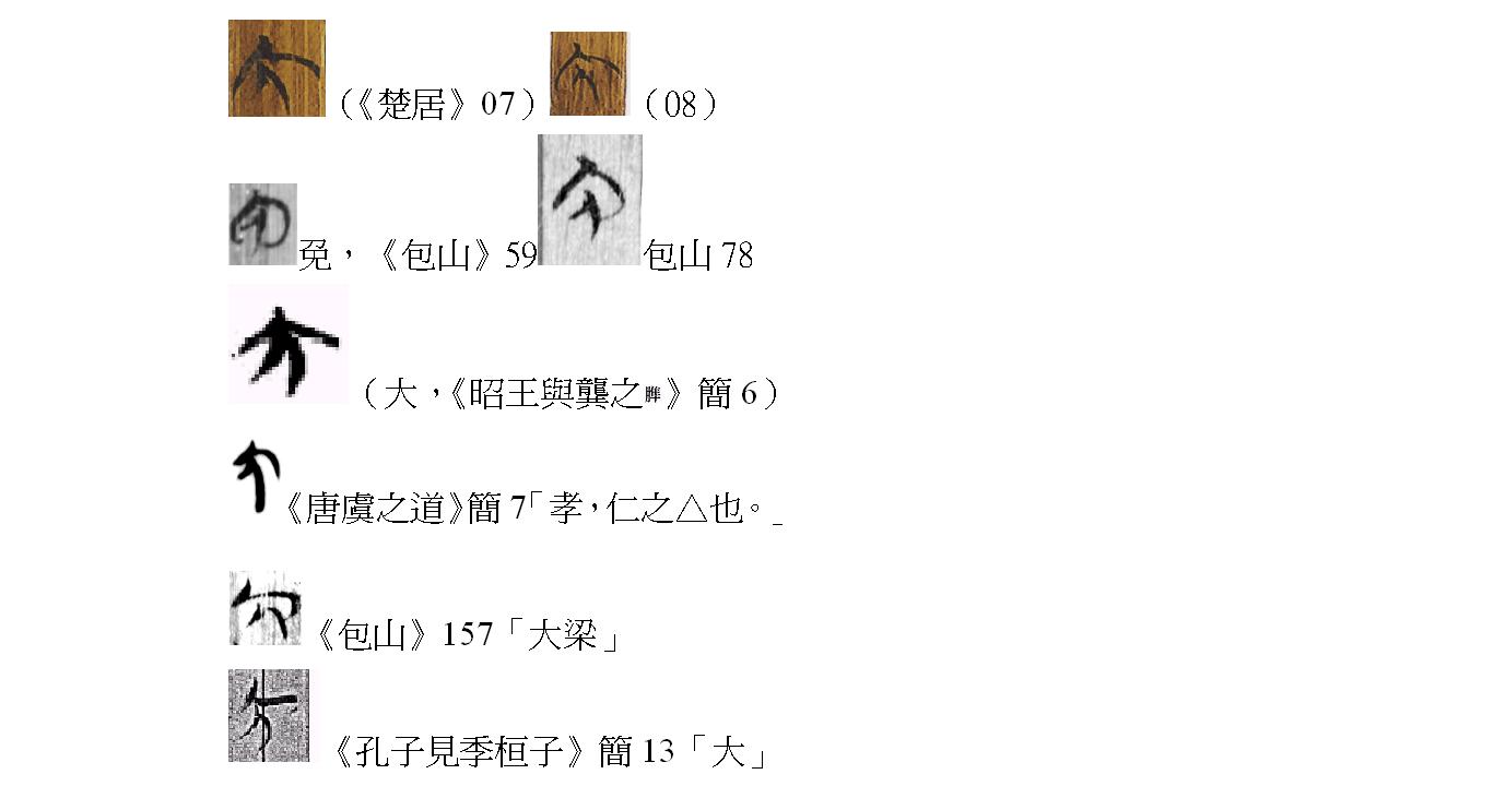 楚簡(jiǎn)「之」字有一種很少人留意到的特殊寫法,其構(gòu)形重複了右上的那一筆,單獨(dú)看的話會(huì)以為是書手的誤寫,整個(gè)蒐集起來(lái)才能略顯端倪。在〈曹沫之陣〉發(fā)表後,曾有學(xué)者拿侯馬盟書的C字,認(rèn)為〈曹沫之陣〉的B字是受到晉系文字所影響,現(xiàn)在看來(lái)沒什麼必要,這就是戰(zhàn)國(guó)時(shí)期「之」字的異體。