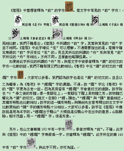呵呵,洪濤兄所說(shuō)正是我前文的意思??坚屛淖制灾萍s很重要的,如楚居簡(jiǎn)一那個(gè)字整體形體就是“前”,書手寫了隨意,我們不能認(rèn)真起來(lái)說(shuō)是躍。反過(guò)來(lái)說(shuō),這幾個(gè)躍字哪一個(gè)上面還有止旁呢?一個(gè)都沒有啊。所以不會(huì)很難判斷。