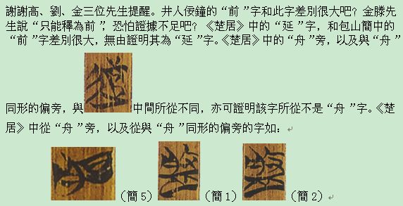 原來(lái)小蟲就是洪濤兄,大家都猜錯(cuò)了。小文〈《上博五‧弟子問(wèn)》「延陵季子章」新釋〉,「2010簡(jiǎn)帛資料文哲研讀會(huì)成果發(fā)表暨全國(guó)簡(jiǎn)帛資料研討會(huì)論文」(臺(tái)北:臺(tái)灣師大國(guó)文系,2010.12)也是贊同釋為『延』之說(shuō),並詳加論證。其實(shí)《包山》193就是很好的例證,簡(jiǎn)文中正好有前與脠字,可以比對(duì)。