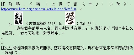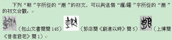 這些朝從潮的初文沒有問(wèn)題,上博文字編348-349頁(yè)有類似說(shuō)法,。最明顯是武王踐阼13號(hào)朝字偏旁。甚至耆夜簡(jiǎn)12的朝恐怕也是從潮的初文,讀書會(huì)說(shuō)跟簡(jiǎn)10的躍寫法不同,我實(shí)在看不出哪裡不同。