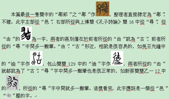 [8] 此字的隸定,學(xué)界主要有“”、“” 兩種意見,相關(guān)討論可參吳良寶《戰(zhàn)國(guó)楚簡(jiǎn)地名輯證》(武漢大學(xué)出版社,2010年,60-62頁(yè))。我們認(rèn)爲(wèi)“” 說(shuō)爲(wèi)是(此還可參黃錫全《長(zhǎng)江中游楚國(guó)“郢”試探》),參前第二則札記。