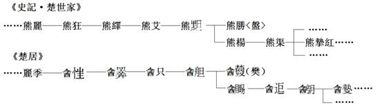 兩世系表中其他楚先王皆能對(duì)應(yīng),只有《史記》熊艾與《楚居》酓只不能密合以及《楚居》多出酓一人。裘錫圭先生考證是乂之初文(參看裘錫圭:《說(shuō)“”、“”》,《古文字論集》,中華書局,1992年,35-39頁(yè))?!搬D” 讀爲(wèi)“熊艾”,完全密合。整理者認(rèn)爲(wèi),“熊艾”與“酓只”的差別係因“艾”、“只”古文字字形相近而訛。我們則認(rèn)爲(wèi),《史記·楚世家》應(yīng)該是誤將兩位楚先王“熊艾”和“熊只”當(dāng)成一人(艾、只古文字字形相近或也是致誤原因之一),在原本應(yīng)該是“熊只”的位置寫上了“熊艾”,而將排在“熊渠”後面的真正的“熊艾”遺漏了。