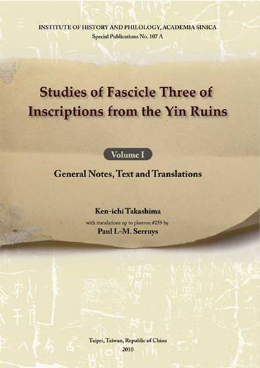 《殷墟文字丙編研究(上冊(cè)):解說(shuō)·隸定·英譯》(Studies of Fascicle Three of Inscriptions from the Yin Ruins, Volume I, General Notes, Text and Translations)由高嶋謙一(Ken-ichi Takashima)與司禮義(Paul L-M. Serruys)合著。本冊(cè)內(nèi)容大部分爲(wèi)中研院史語(yǔ)所出版的同所張秉權(quán)教授所著之《小屯第二本—殷墟文字—丙編考釋:上輯(一),1957;上輯(二),1959;中輯(一),1962;中輯(二),1965;下輯(一),1967;下輯(二),1972》共六大冊(cè)全部卜辭之英譯。對(duì)《丙編》之釋文及考釋,司禮義和高嶋謙一兩譯者或有校訂(司禮義校訂止於《丙編》632中之259);對(duì)張秉權(quán)教授之解說(shuō),譯者亦加以翻譯且闡明己見(jiàn)。本卷目的在於揭示對(duì)甲骨文之正確理解。