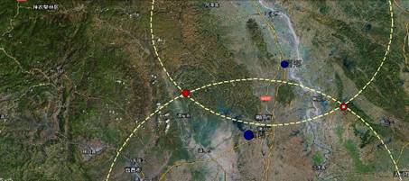 里耶簡J1 ○1652記載了銷的詳細(xì)位置:鄢到銷百八十四里,銷到江陵二百卌六里[5] ,江陵到孱陵百一十里,孱陵到索二百九十五里,索到臨沅六十里,臨沅到遷陵九百一十里?!酢跚陌賲c里。里耶簡提供的信息可以說是考證“銷”地地望最可靠的資料,完全可以根據(jù)此記載用軟件[6] 在地圖上較精確地定位。我們先以“江陵到孱陵百一十里”檢驗一下里耶簡記載的準(zhǔn)確度。秦代一里約相當(dāng)於415.8米,一百一十里相當(dāng)於45.738千米,在地圖上測量出江陵(中心點)到孱陵(中心點)的距離是45.1千米,大致相當(dāng)??梢娎镆喫涊d的里數(shù)是比較準(zhǔn)確的。鄢(即宜城)到銷百八十四里即76.5072千米,銷到江陵二百卌六里即98.1288千米,我們分別以鄢和江陵爲(wèi)圓心,以上述兩個數(shù)據(jù)爲(wèi)半徑畫兩個圓,相交點應(yīng)該就是銷的兩個最可能的地點,其中一個在臨沮東偏南13千米、今遠(yuǎn)安縣北面約10千米處附近,另一個在今鍾祥市東偏南約22.3千米處。
