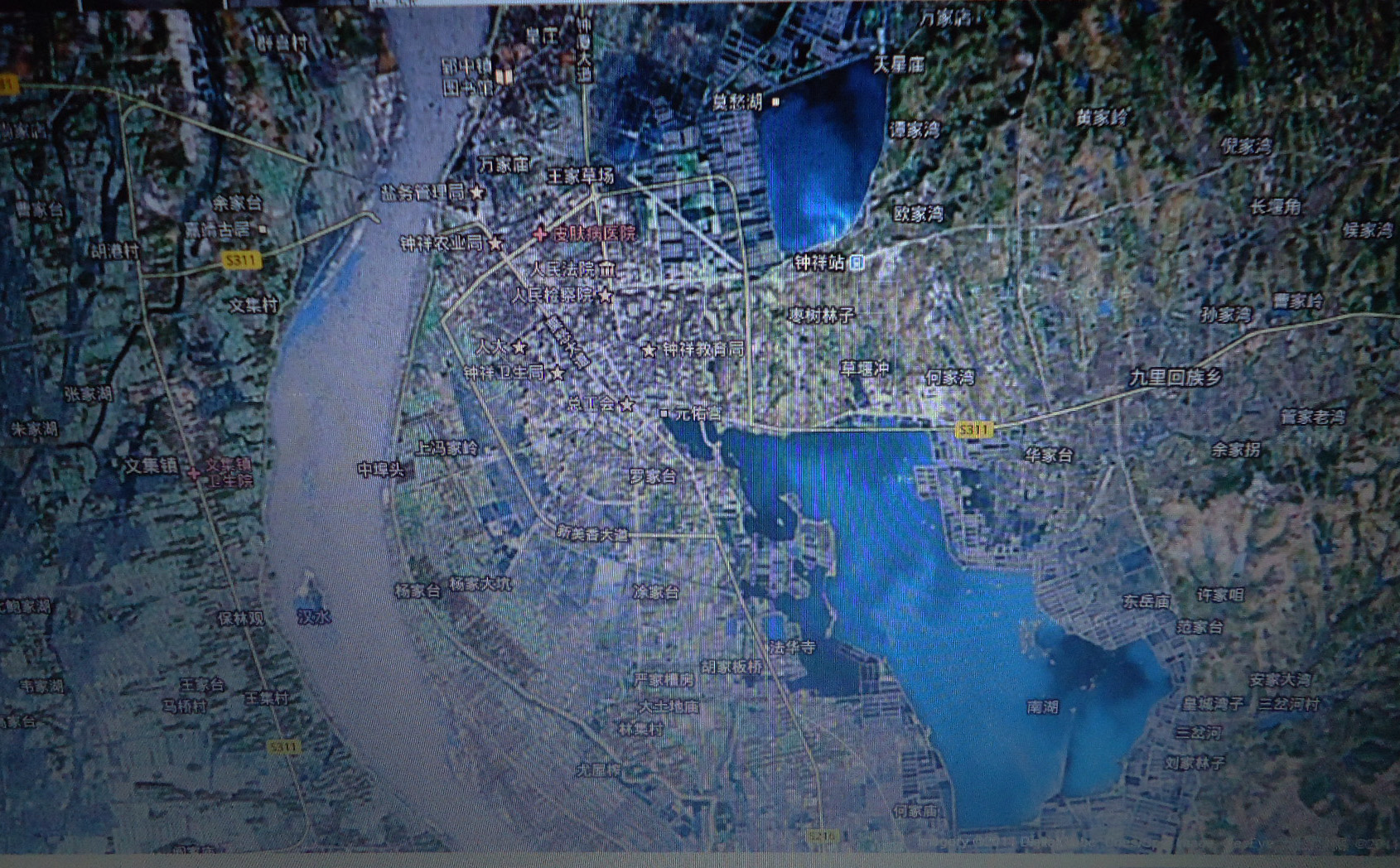鐘祥市區(qū)衛(wèi)星圖:西為漢水,北面為莫愁湖,南面為南湖,兩湖之間西部為郢中鎮(zhèn),樠木山在莫愁湖西南角。