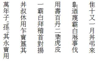唯十又一月,井叔來(lái)拜。于是嘉獎(jiǎng)霸伯從事的征伐工作,(賜予)任用的蒙車轂的皮革一百、丹砂二