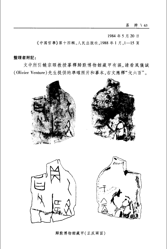 再據(jù)張政烺的考證,“互卦”的出現(xiàn)可追訴到商高宗武丁時代。在巴黎歸默博物館的館藏甲骨中,一片殷虛第一期的卜甲上,反面刻有“六一一六”。(《甲骨續(xù)存》一九八〇)、《甲骨文合集》二九〇七四的上面刻有“六七七六”,這些甲文中的四宇一體圖樣,張政烺認為都是四爻卦,這些四爻卦就是互體卦。[9]