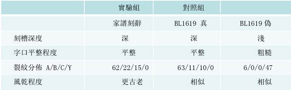 最後我們將《庫》1506家譜刻辭與《庫》1619骨版的真?zhèn)慰剔o就刻槽深度、字口平整程度、刻劃與裂紋的物理關(guān)係分析、及兩片骨版的風(fēng)乾程度所作比較的結(jié)果列在表三。