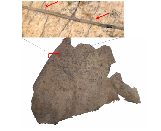 字則完全看不到這樣的鋸齒狀字口。圖13及14的結(jié)果證明艾蘭以字口平整鑑別真?zhèn)螠蕜t之一是可信的。以此準則來看,圖15的結(jié)果有力的顯示家譜刻辭應(yīng)是商代所刻真品。