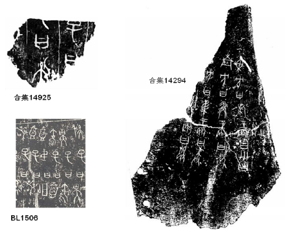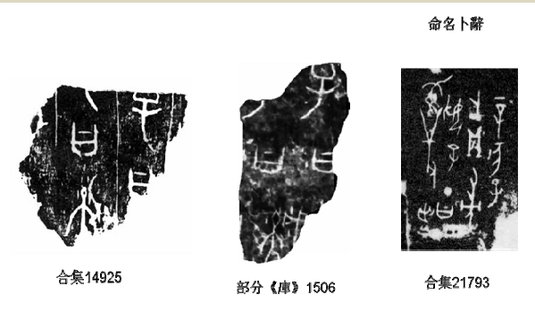1956:陳夢家在《殷墟卜辭綜述》一書(1988年版,頁499-501)以《庫》1506片刻辭,《燕京大學(xué)藏殷契卜辭》之《燕》209(即合集14925)與《殷虛文字乙編》之《乙》4856(即合集21727)三片作為商代家譜刻辭之例。[4]