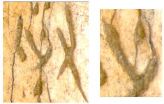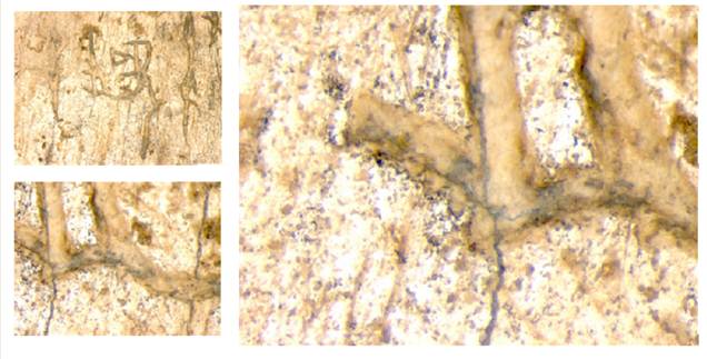 表一的結(jié)果顯示了以全版刻辭的裂紋分佈可以提供一個幾乎是涇渭分明的區(qū)分商代肩胛骨刻辭真?zhèn)蔚臏蕜t。利用同樣方法我們仔細以顯微鏡觀察《庫》1506家譜刻辭上54個刻字與骨版裂紋的關(guān)係。圖18是兒氏家譜刻辭中可見的A型裂紋,圖19是典型的B型裂紋,圖20是典型的C型裂紋。我們計算各型裂紋在54個刻字的分佈發(fā)現(xiàn)兒氏家譜刻辭中只見A,B,C三型裂紋而完全不見Y型裂紋,更有意思的是A,B,C三型裂紋在家譜刻辭的分佈比例與《庫》1619左方刻辭幾乎完全一樣(表二)。