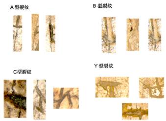 (3)裂紋走向:我們首先以顯微鏡比較觀察《庫》1619版上真刻與偽刻的物理差異,特別注意扇形骨版上細微裂紋的走向與刻劃的關(guān)係。艾蘭提出在扇形肩胛骨刻辭為真時,後起的裂紋常會沿刻辭豎筆成一致走向而穿過槽底。裂紋與刻辭豎筆走向一致,我們稱之為A型紋,如果刻槽比較乾淨(jìng),還可以清楚看見裂紋穿過槽底,我們把可以見之於槽底的裂紋稱之為B型紋。我們觀察《庫》1619此片左方真刻可見細微裂紋與刻劃走向一致,這個現(xiàn)象在右方偽刻幾乎看不到(圖1316A)。這樣的區(qū)別在放大的顯微鏡下更為明顯(圖16B)。我們再以真刻中的“祭”字為實例(圖16C),顯微鏡下不但可以看見裂紋與豎筆刻劃走向一致(A型紋),也可以明顯看見刻劃槽底有裂紋穿過(B型紋)。圖16的結(jié)果證明艾蘭以A同B型裂紋作為判斷真?zhèn)蔚奈锢頊蕜t經(jīng)得起驗證。另外除了A與B型裂紋外,有時可以看見刻劃槽底裂紋也會隨著彎曲的刻劃而轉(zhuǎn)彎,或者因為刻劃擋路而略為彎曲轉(zhuǎn)向。這種裂紋我們稱之為C型裂紋。(見圖16C右)除此三種裂紋外,我們注意到在《庫》1619版右方的偽刻,往往因為裂紋的存在在先,偽刻在後,一些靠近裂紋的刻劃有向裂紋處延伸或擴張的爆裂現(xiàn)象,這樣會影響刻劃的裂紋我們稱之Y型紋。(見圖13右邊)。為方便識別起見,我們這四種裂紋的典型例子並列於圖17。仔細考察這四種裂紋在《庫》1619左右兩組真?zhèn)慰剔o中的分佈,可得到如表一所列數(shù)據(jù)。由表一可見A,B,C這三型裂紋幾乎完全不見於右方的偽刻之中。而Y型紋則完全不見於左方真刻之中。