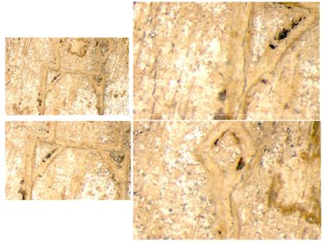 另外筆者在立體顯微鏡下仔細觀察扇形肩胛骨的裂痕或裂紋,發(fā)現(xiàn)這些裂紋並非呈黑色,因之也無所謂墨漬問題。(見圖18-20)至於學(xué)者認為一些清末出土的殷墟甲骨因為地下水位還高,濕度適於骨質(zhì)保存,所以因為風(fēng)乾所產(chǎn)生的裂紋可以在~1904年偽刻之後產(chǎn)生。以是不能以刻劃先,裂紋後作為真刻的必然證據(jù)。這個提法至少在家譜刻辭這片骨版是不適用的。理由如下:(1)家譜刻辭的骨版如果出土?xí)r骨質(zhì)猶存尚未風(fēng)乾,為何成半殘缺?(2)比較觀察《庫》1506及《庫》1619兩片骨版的背面,可以很明顯的看出《庫》1506骨版的風(fēng)乾程度遠超過《庫》1619骨版(圖21),表示家譜刻辭骨版出土?xí)r,不可能骨質(zhì)猶存。所以其上裂紋也不可能為近百年的產(chǎn)物。