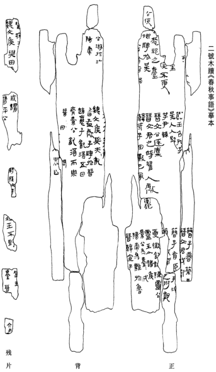 出土木牘或有斷裂破碎者,大多於發(fā)表時已被正確拼合。也有個別殘破過甚難以復(fù)原的,如阜陽雙古堆西漢墓所出二號木牘(即所謂“《春秋事語》章題木牘”),尚有六塊殘片原未拼入大版中。如下圖(韓自強《阜陽漢簡〈周易〉研究》168頁,上海古籍出版社2004年):