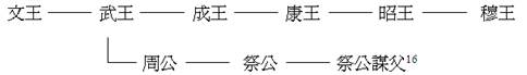 《祭公之顧命》記祭公謀父年邁病重,穆王前往探視,祭公對(duì)穆王的訓(xùn)誡。文中穆王稱祭公謀父為“祖”,《逸周書(shū)》的《周書(shū)序》曰:“穆王因祭祖不豫,詢某(謀)守位,作《祭公》?!?A title="" name=_ednref15 href="#_edn15">[15]李學(xué)勤先生曾考定此祭公謀父與康王同輩。我們將李先生所列之祭公家族與周王世系關(guān)係表迻錄於下: