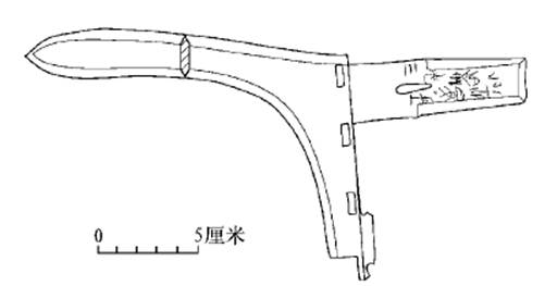 從報(bào)告中的線圖來看,該戈下闌側(cè)有一齒狀突起。這一形制特點(diǎn)又見於魏惠王時期的“卅三年
