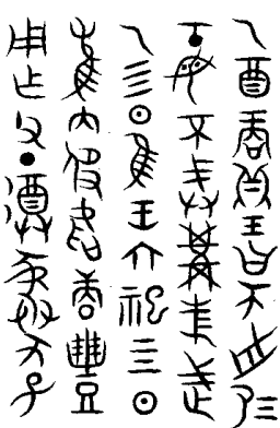 ”(虞司寇壺),根據(jù)陸本,此字“口”字可能是本在左下方的“爪”形下,其它諸本爲(wèi)了構(gòu)形好看而將其移到了“欠”字下。甲骨文中亦有“吹”字,為地名;金文中用為人名。這裡可能是奏樂(lè)鼓吹的意思,《禮·月令》:“命樂(lè)正入學(xué)習(xí)吹”;又:“季冬,命樂(lè)師大合吹而罷”,其後起專(zhuān)字作“䶴”,亦作“龡”?!墩f(shuō)文》:“䶴,音律管壎之樂(lè)也。”《合集》27310言“叀祖丁庸,奏”,當(dāng)是在庸祭時(shí)奏樂(lè),該銘文則是說(shuō)在庸、豐祭祀時(shí)吹奏音樂(lè),二者實(shí)同。
