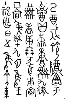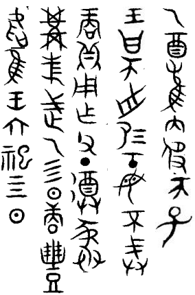 乙酉,雟侑(右)帀子,王曰:“帀舟,易(賜)工(功),母(毋)不戒?!鄙蹋ㄙp)貝,用乍(作)父丁尊彝。冓(遘)旂(祈)武乙彡(肜)日,庸、豐,吹。隹(惟)王六祀,彡(肜)日。