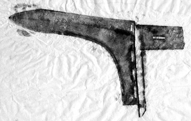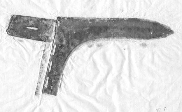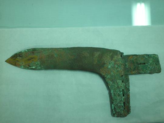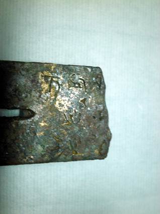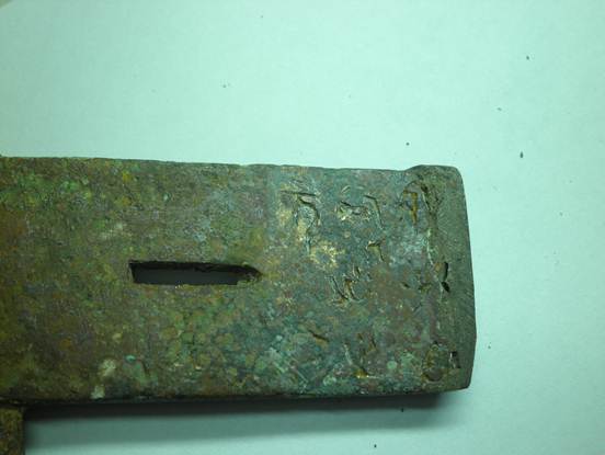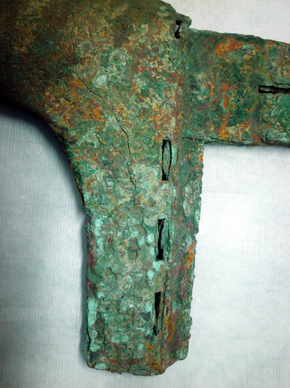 M1:47戈出土后修復(fù)時(shí),內(nèi)部銘文為膠水覆蓋,僅留一點(diǎn)痕跡,故未引起人們重視,此為清理以后最初的照片。