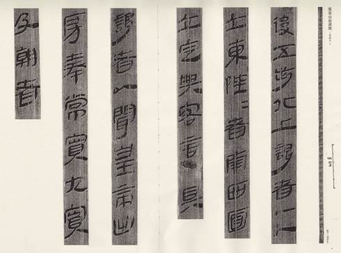 我們首先把《名跡選》所錄清晰圖版(最右側(cè)是原大圖版,左側(cè)是放大圖版,比例尺為筆者所加)和釋文抄錄如下:[8]
