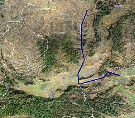 圖二:《禹貢》“道河積石,至于龍門,南至于華陰,東至于厎柱,又東至于孟津”在地圖上的示意圖。