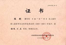 5.2006年,陳劍副教授的《說“安”字》一文獲上海市第八屆哲學(xué)社會(huì)科學(xué)優(yōu)秀成果獎(jiǎng)?wù)撐念惾泉?jiǎng)。