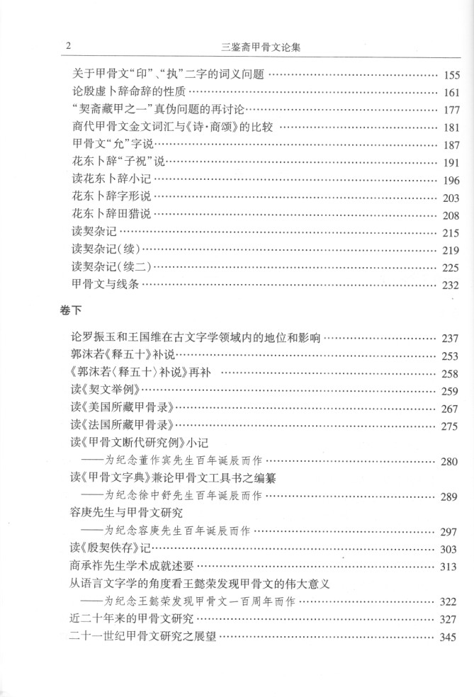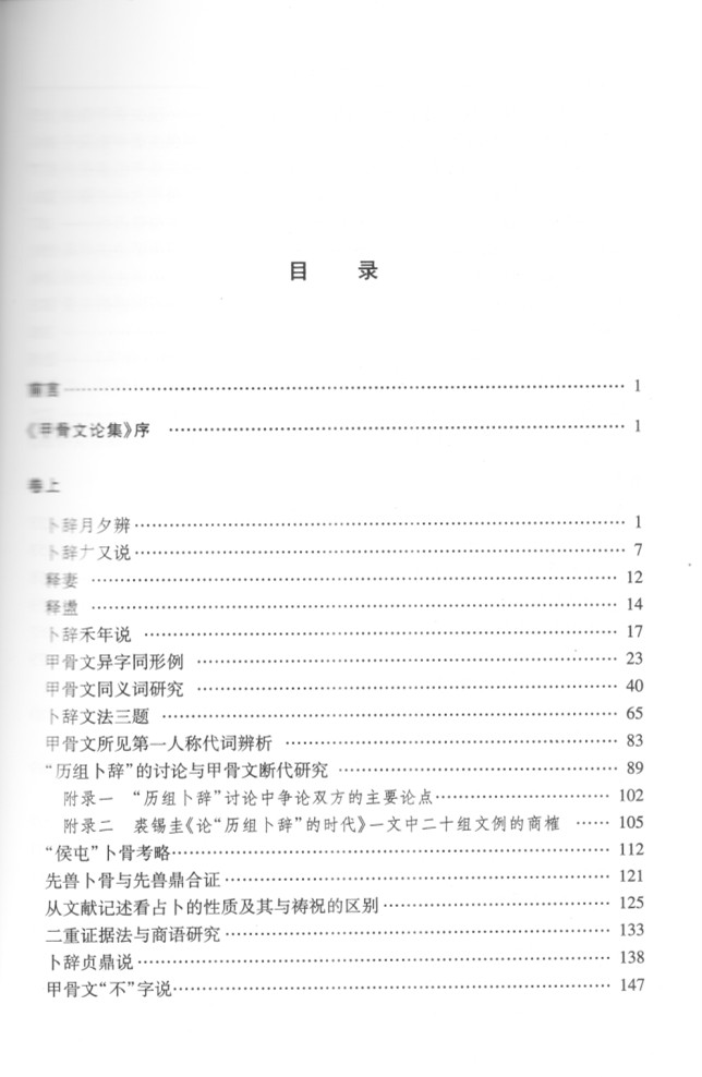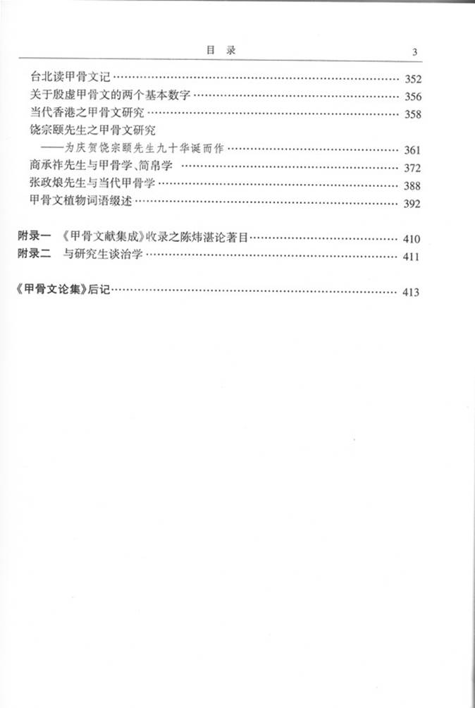 本書實(shí)乃拙著《甲骨文論集》之增訂本,冠以齋名,是出版社有關(guān)領(lǐng)導(dǎo)的雅意,以有別于原著,亦略異于同類性質(zhì)之論文集。所謂增訂,主要是“增”,即將二〇〇三年論集出版時所未收及近十年間續(xù)作者補(bǔ)入,計上卷九文:《甲骨文“允”字說》,《花東卜辭“子?!闭f》,《讀花東卜辭小記》,《花東卜辭字形說》,《花東卜辭田獵說》,《讀契雜記》,《讀契雜記(續(xù))》,《讀契雜記(續(xù)二)》,《甲骨文與線條》;下卷四文:《饒宗頤先生之甲骨文研究——為慶賀饒宗頤先生九十華誕而作》,《商承祚先生與甲骨學(xué)、簡帛學(xué)》(與譚步云合著),《張政烺先生與當(dāng)代甲骨學(xué)》,《甲骨文植物詞語綴述》,凡十三文。所增諸文,多賴陳偉武、譚步云、禤健聰三學(xué)弟據(jù)手稿輸入電腦并仿造甲骨文等原形字,或掃描輸入,或處理相關(guān)圖形。其間禤君用力尤多。特志之以申謝忱。