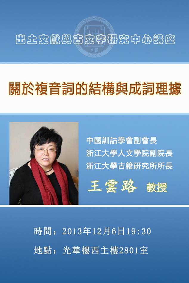 中國(guó)訓(xùn)詁學(xué)會(huì)副會(huì)長(zhǎng)、浙江大學(xué)人文學(xué)院副院長(zhǎng)、浙江大學(xué)古籍研究所所長(zhǎng)王雲(yún)路教授將於12月6日晚19:30在我中心作題為“關(guān)於複音詞的結(jié)構(gòu)與成詞理?yè)?jù)”的學(xué)術(shù)講座。